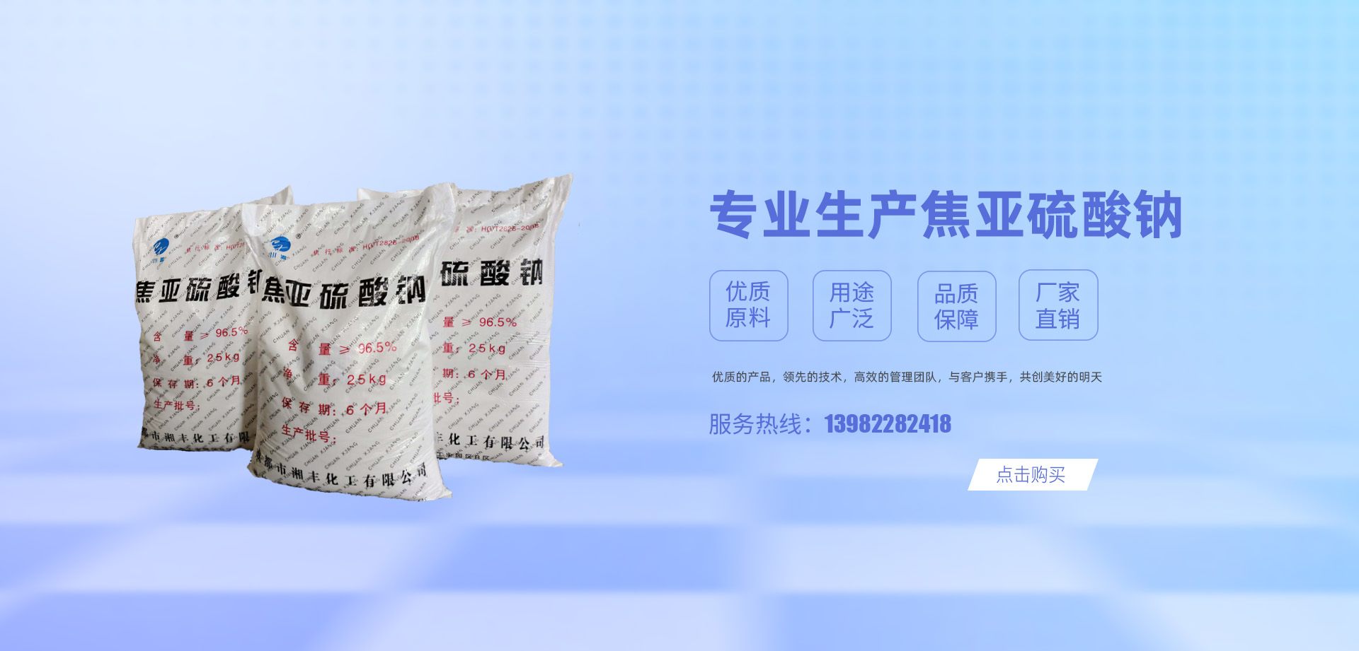成都市湘豐化工有限公司座落在四川省成都市新津精細化工園中,占地10000多平方米,是一家有十幾年焦亞硫酸鈉生產經驗的企業,設計年生產能力2萬噸。 焦亞硫酸鈉又稱二硫五氧酸鈉,重硫氧,有著廣泛的用途:在醫藥工業中用于生產氯仿、苯丙砜和苯甲醛;橡膠工業用做凝固劑;印染工業用作棉布漂白后的脫氯劑、棉布煮煉劑;制革工業用于皮革處理,能使皮革柔軟,豐滿、堅韌,具有防水、抗折、耐磨等性能...